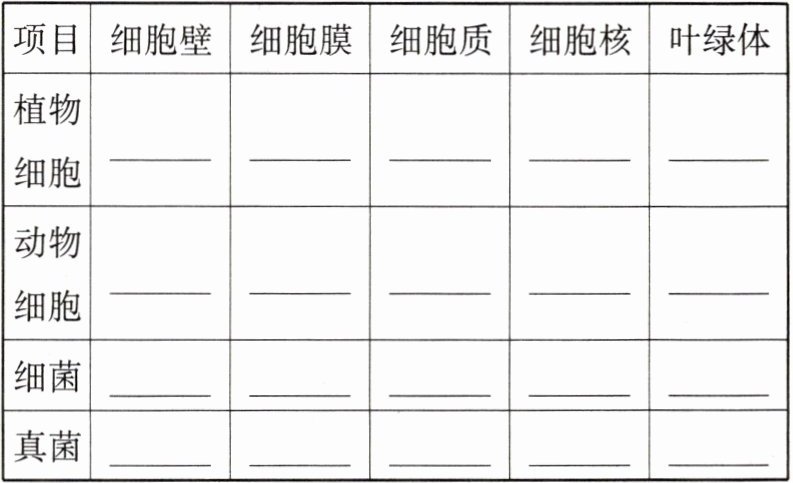 |项目|细胞壁|细胞膜|细胞质|细胞核|叶绿体|