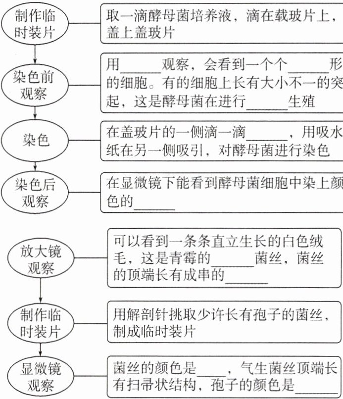 C --> D[用______观察,会看到一个个______形的细胞。有的细胞上长有大小不一的突起,这是酵母菌在进行______生殖]