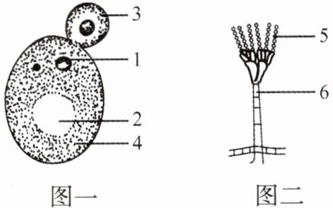 4. 如图是某学生做“观察酵母菌和霉菌”实验时,绘制的显微镜下观察到的酵母菌(图一)和青霉(图二)的形态结构图,请你根据做过的实验和观察到的实验现象,回答下列问题。