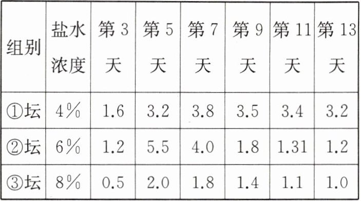 5. 泡菜的制作工艺是我国悠久的饮食文化遗产之一。腌制泡菜的过程中,应控制亚硝酸盐在一定浓度范围内,以免对人体产生危害。《食品安全国家标准 食品中污染物限量》(GB 2762—2022)中规定:蔬菜及其制品中亚硝酸盐含量应不超过 $ 20mg/kg $。如下表是某兴趣小组探究“盐水浓度对泡菜发酵过程中亚硝酸盐含量的影响”得到的数据,请分析回答下列问题。