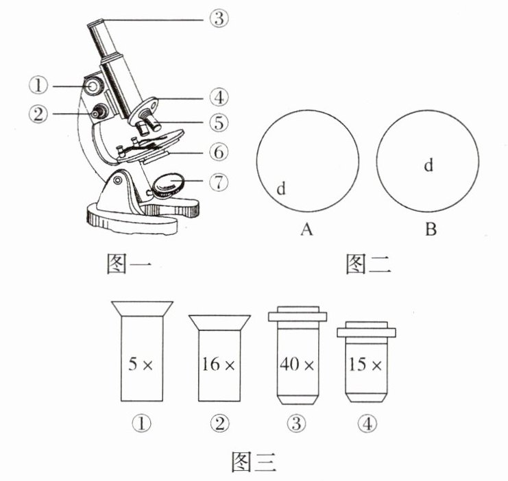(1)在对光过程中,最后一步是转动图一中的[ ]____,使光线经过通光孔反射到镜筒内,通过目镜可以看到明亮的圆形视野。