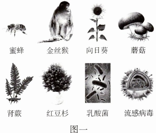 8. 某小组搜集了如图一所示的生物图片,按图二中的分类方法进行了生物分类。请根据所学知识,据图分析回答下列问题。