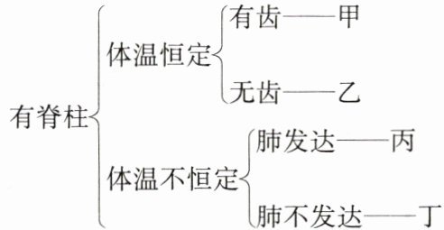 C 解析:甲是鼯鼠,属于哺乳动物,体表被毛,胎生、哺乳,有齿。乙是红嘴蓝鹊,属于鸟,无齿,体温恒定,卵生,用气囊辅助呼吸。丙是眼镜蛇,属于爬行动物,有鳞片,可防止体内水分蒸发,用肺呼吸,体温不恒定。丁是泽蛙,属于两栖动物,体外受精,卵生,成体用肺呼吸,皮肤辅助呼吸。
