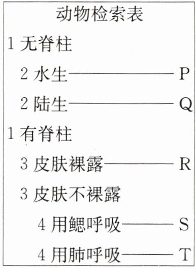 7. 通过查阅检索表,可以确定生物的分类地位,判断不同生物之间的亲缘关系。如表为动物检索表的一部分,P、Q、R、S、T 表示动物类群,下列有关说法正确的是 ( )