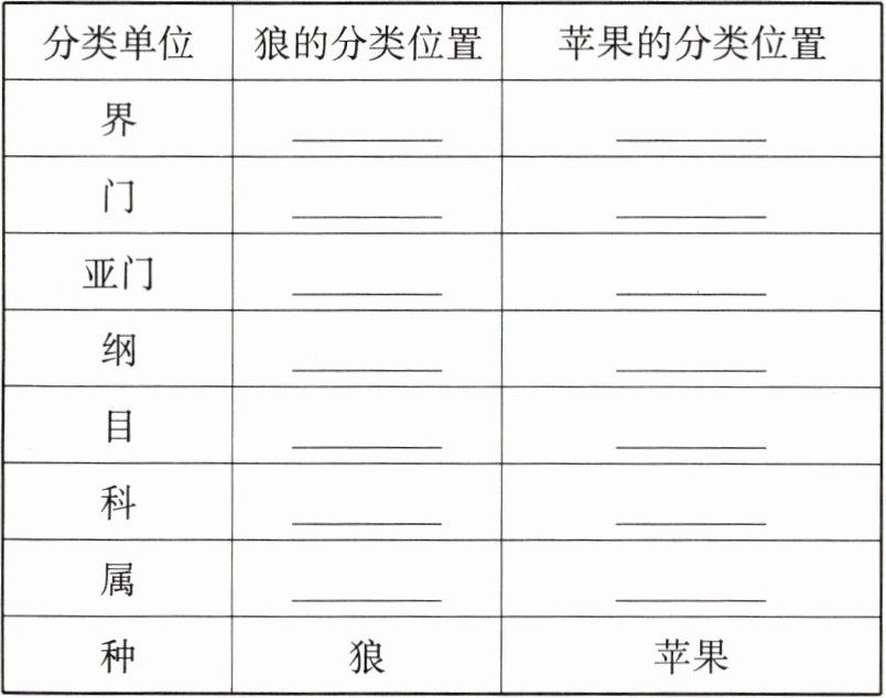 (1)狼和苹果在生物分类中的位置。