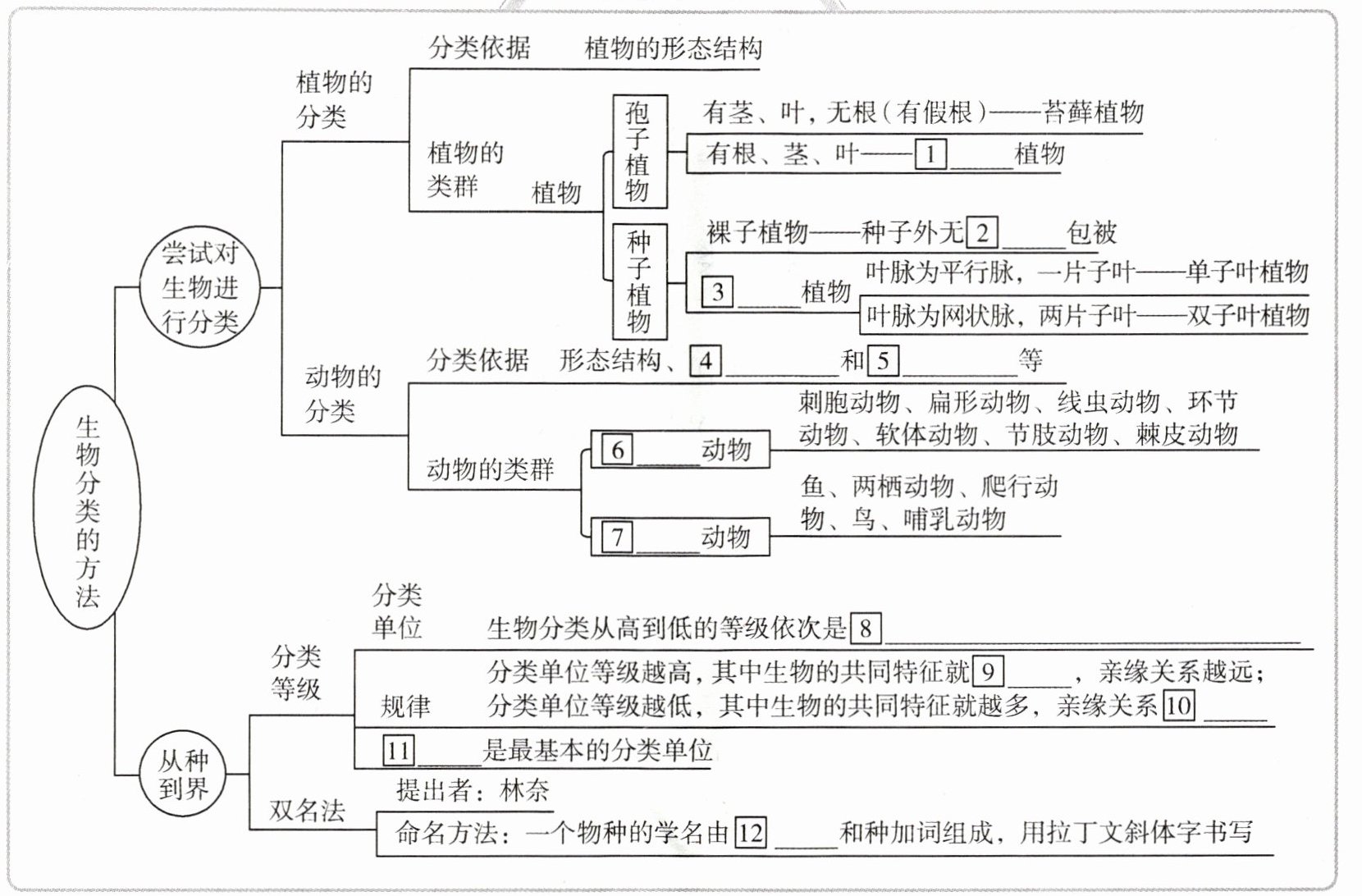 1.蕨类 2.果皮 3.被子 4.生理功能 5.生殖方式 6.无脊椎 7.脊椎 8.界、门、纲、目、科、属、种 9.越少 10.越近 11.种 12.属名