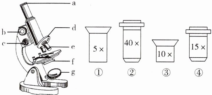 D 解析:显微镜的放大倍数等于目镜放大倍数与物镜放大倍数的乘积,则[a]目镜和[e]物镜具有放大物像的作用。转动[d]转换器可以换用不同放大倍数的物镜。细准焦螺旋能较小幅度地升降镜筒,使物像更清晰。故换高倍镜后需要调节[c]细准焦螺旋使物像更清晰。显微镜的放大倍数越小,视野范围越大,视野中的细胞数量越多,故视野中细胞数量最多的镜头组合是①和④。