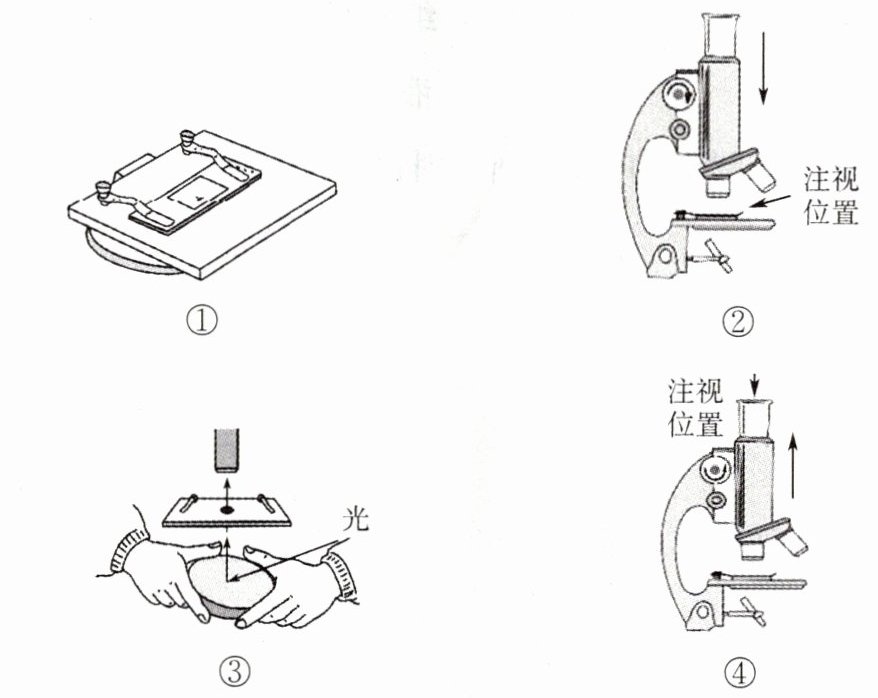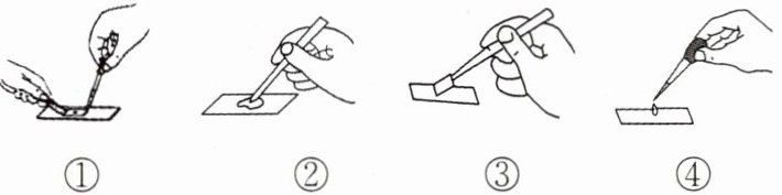 A 解析:步骤①滴加的液体是碘液,是为了将细胞核染成深色,便于观察,步骤④滴加的液体是生理盐水,是为了保持细胞正常的形态;步骤②可使细胞分散,防止细胞重叠,便于观察;制作人的口腔上皮细胞临时装片的步骤简要的概括为擦、④滴、刮、②涂、③盖、①染、吸。因此正确的操作顺序是④②③①;观察临时装片时视野中有气泡,原因可能是步骤③操作不当。