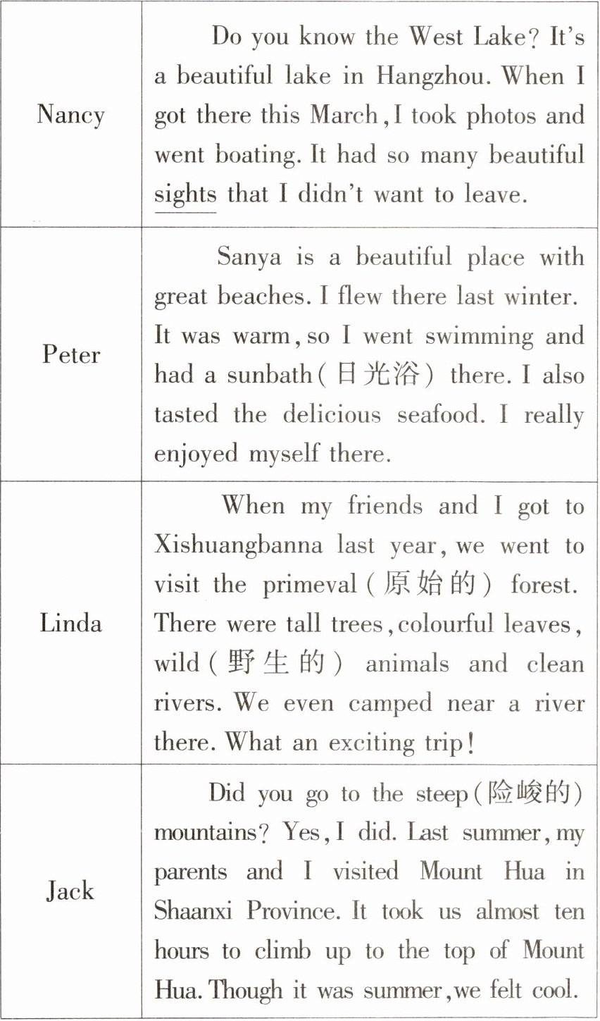 26.A[提示:词义猜测题。画线的词是 sights,结合上下文的描述可知,西湖有许多美丽的"景色",以至于我都不想离开了,故选 A。] 27.B[提示:推理判断题。根据 Peter 描述中的"I really enjoyed myself there."可知,Peter 在三亚玩得很开心,故选 B。] 28.B[提示:细节理解题。根据 Linda 描述中的"We even camped near a river there."可知,她在河边露营了,故选 B。] 29.D[提示:细节理解题。根据 Jack 描述中的"Last summer, my parents and I visited Mount Hua in Shaanxi Province."可知,他和父母去了华山,故选 D。] 30.D[提示:推理判断题。根据 Jack 描述中的"Did you go to the steep(险峻的) mountains?"可知,他认为华山是险峻的,故选 D。]
