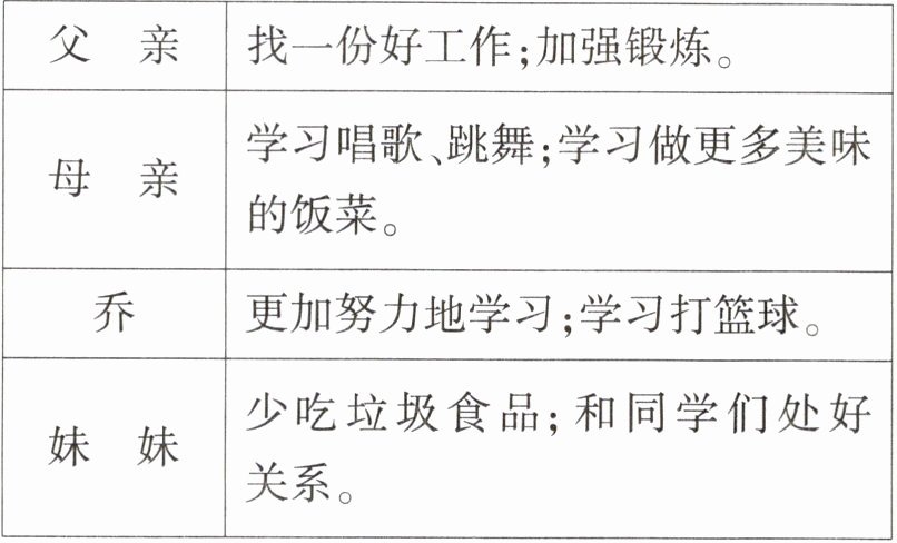 Ⅱ. The new year is coming. Everyone in Joe's family has their own plans. Joe's father is going to find a good job to make more money. Also, he is going to get more exercise to keep healthy. Joe's mother is going to learn to sing and dance and learn to cook more delicious food. Joe plans to study harder and learn to play basketball. Joe's sister is going to eat less junk food and have a better relationship with her classmates.