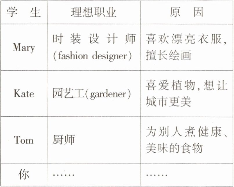 Mary wants to be a fashion designer because she likes beautiful clothes and is good at drawing. Kate hopes to be a gardener because she loves plants and wants to make her city more beautiful. Tom likes cooking healthy and delicious food for others, so he hopes to be a cook in the future. My dream is to be a teacher because I love to work with children.