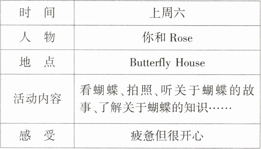 假如上周六你和朋友 Rose 一起去参观了蝴蝶馆(Butterfly House)。请根据表格中的信息,写一篇题为“A Trip to the Butterfly House”的短文,介绍一下你上周六的见闻。