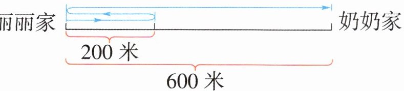 例 1 丽丽家离奶奶家 600 米。一次她去奶奶家,走了 200 米后突然想起来忘记拿书包了,于是返回家取书包。这次丽丽去奶奶家一共走了多少千米?