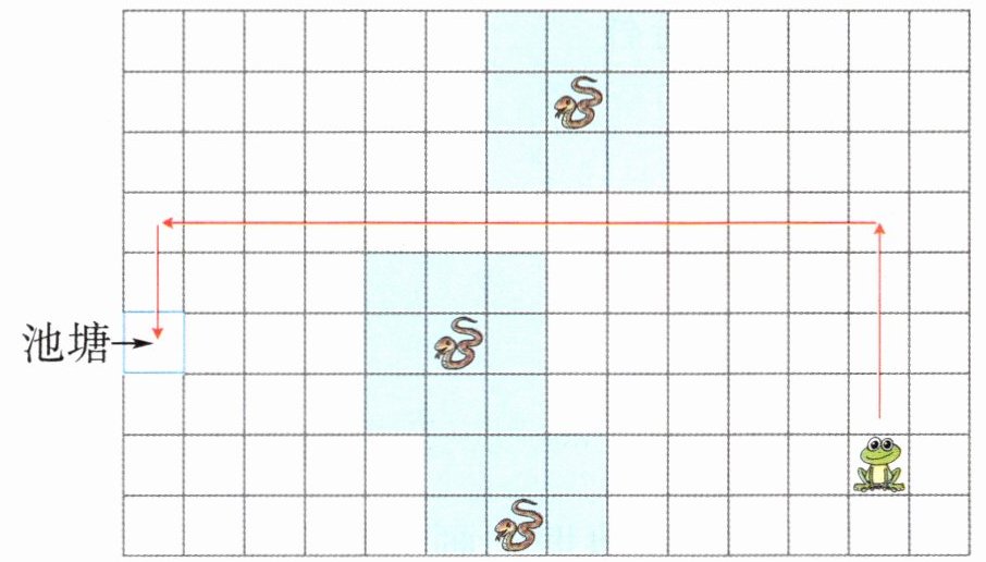例1 青蛙顺着方格怎样走才能安全地回到池塘?画线表示出来。(蛇在以各自为中心的九宫格内活动)