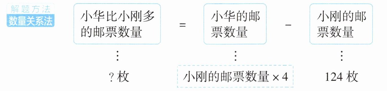 方法一:数量关系法:小华比小刚多的邮票数量 = 小华的邮票数量 - 小刚的邮票数量,小华的邮票数量 = 小刚的邮票数量×4。
