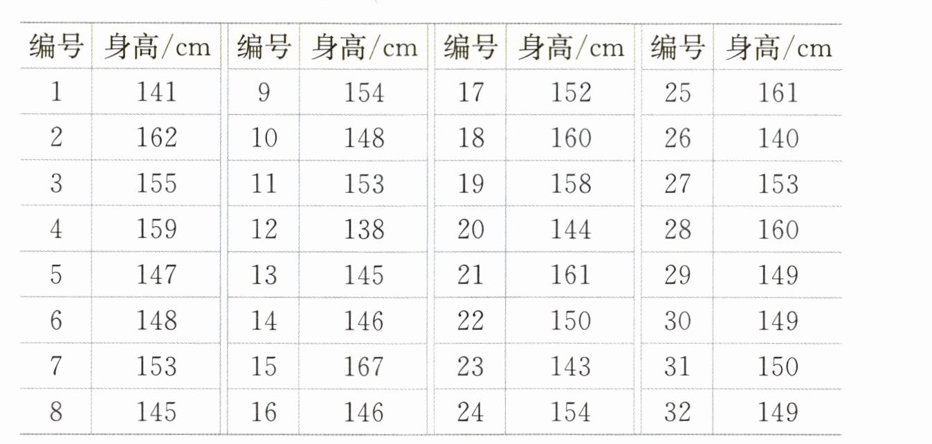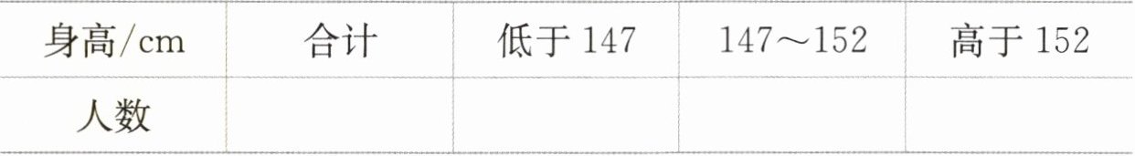 例2 星光小学准备为学校鼓号队的队员购买服装。服装分为大号、中号和小号。身高低于147厘米的队员适合穿小号服装,147~152厘米的队员适合穿中号服装,高于152厘米的队员适合穿大号服装。根据数据填写统计表,并判断每种服装分别需要买多少套。
