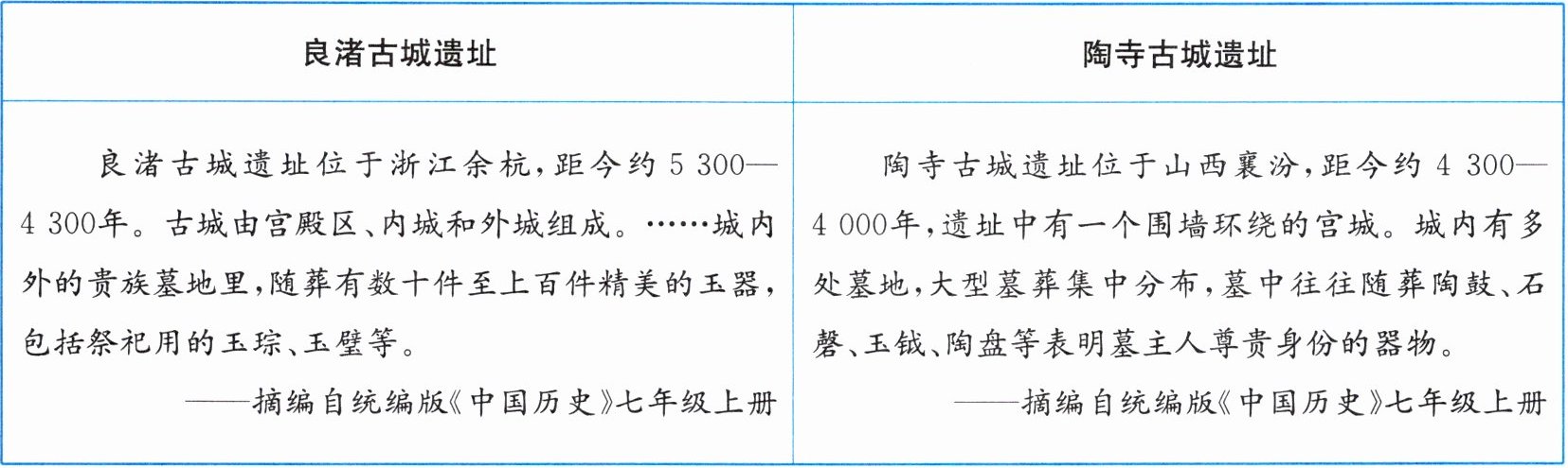 |良渚古城遗址位于浙江余杭,距今约 5 300 - 4 300 年。古城由宫殿区、内城和外城组成。……城内外的贵族墓地里,随葬有数十件至上百件精美的玉器,包括祭祀用的玉琮、玉璧等。|陶寺古城遗址位于山西襄汾,距今约 4 300 - 4 000 年,遗址中有一个围墙环绕的宫城。城内有多处墓地,大型墓葬集中分布,墓中往往随葬陶鼓、石磬、玉钺、陶盘等表明墓主人尊贵身份的器物。|