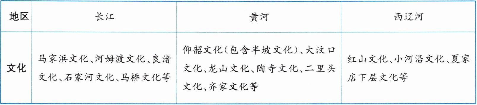 |文化|马家浜文化、河姆渡文化、良渚文化、石家河文化、马桥文化等|仰韶文化(包含半坡文化)、大汶口文化、龙山文化、陶寺文化、二里头文化、齐家文化等|红山文化、小河沿文化、夏家店下层文化等|