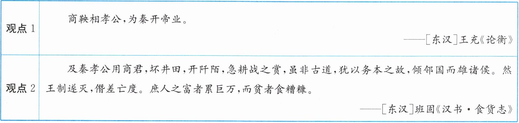 (3)观点1持肯定赞扬的态度,认为商鞅变法使秦国富国强兵,为秦统一中国奠定基础。观点2认为商鞅变法使得秦国富国强兵,但同时批评了商鞅变法使社会动荡加剧,贫富差距加大。