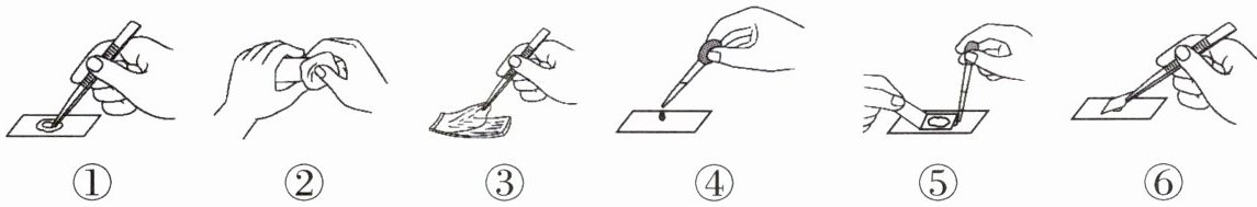 B【解析】 制作洋葱鳞片叶内表皮细胞临时装片的操作步骤:②擦,即用洁净的纱布将载玻片和盖玻片擦拭干净;④滴,即用滴管在载玻片的中央滴一滴清水;③取,即用镊子撕取一小块洋葱鳞片叶内表皮;①展,即用镊子展平;⑥盖,即用镊子夹起盖玻片,使它的一边先接触载玻片上的水滴,然后缓缓放下;⑤染,即在盖玻片的一侧滴1~2滴碘液,用吸水纸从盖玻片的另一侧吸引,使碘液浸润标本。