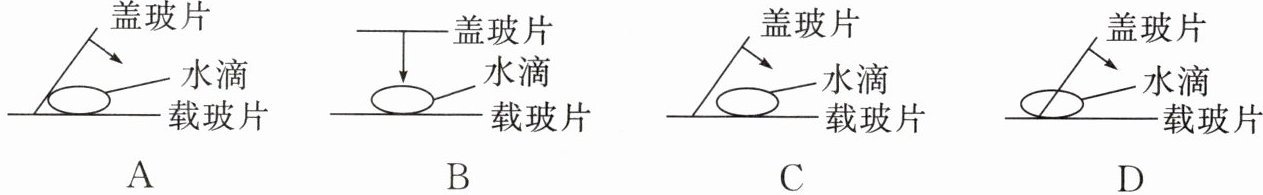 A 解析 盖盖玻片时,应用镊子夹起盖玻片,使它的一边先接触载玻片上的水滴,然后缓缓放下,避免产生气泡。
