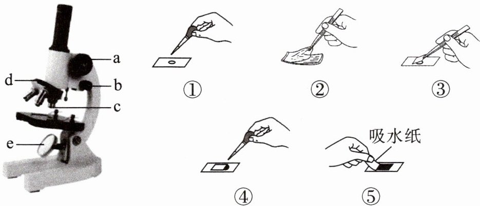 12.在初中生物学实验技能考试中,某同学抽到“制作并观察洋葱鳞片叶内表皮细胞临时装片”的实验。下面是单目显微镜的结构模式图和该同学的部分操作示意图。请据图回答下列问题。