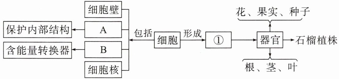 12. 概念图是一种直观呈现知识结构的方式。下图是石榴植株的结构层次概念图,其中 A、B 表示植物细胞结构,①表示某个结构层次。请据图回答下列问题。