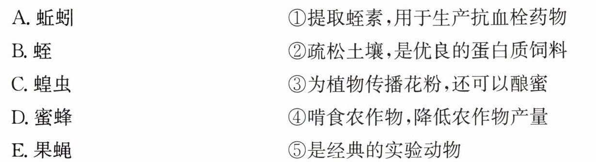 阅读教科书第 76~77 页,将无脊椎动物与其作用或危害连线。