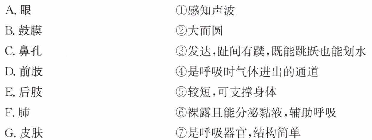 1. A—② B—① C—④ D—⑤ E—③ F—⑦ G—⑥ 2. 两栖动物的主要特征是:幼体生活在水中,用鳃呼吸;成体大多生活在陆地上,也可在水中游泳,用肺呼吸,皮肤可辅助呼吸。