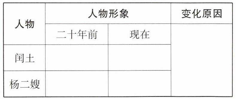 人物 人物形象 变化原因二十年前 现在闰土 健康可爱、天真活泼、勤劳多知、勇敢的小英雄 迷信麻木、毫无觉悟的木偶人 人们生活困苦,缺少基本的生活用品;受到封建思想侵蚀;辛亥革命不彻底,农民、手工业者深受封建势力、帝国主义的压迫和剥削杨二嫂 衣食无忧、安分守己 能说会道、泼辣、尖酸刻薄、自私、爱贪小便宜的小市民
