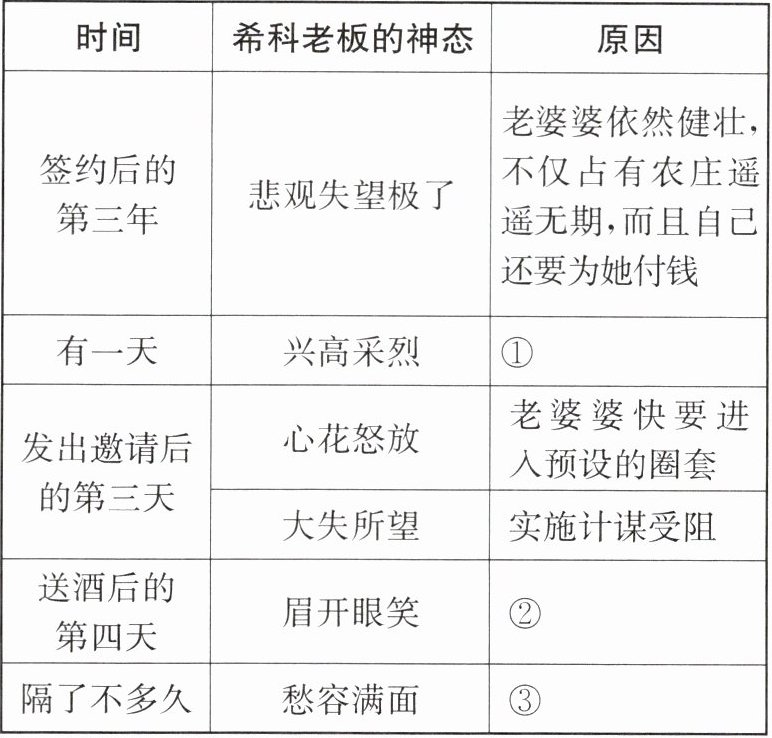 9. 结合上下文,分析希科老板表现出不同神态的原因,然后补填表格内容。