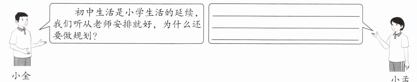 老师布置任务、提出要求后,同学们开始按要求组建了各自的小组,但是有的同学不理解为什么要规划初中生活。下面是他们的对话: