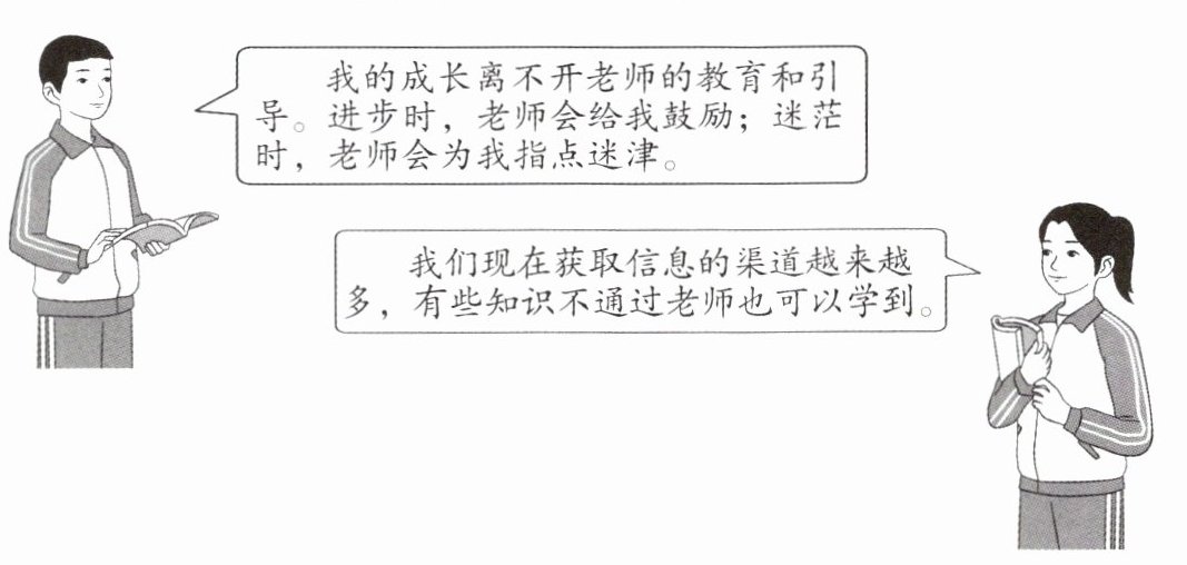 (2)我同意男孩的观点,不同意女孩的观点。因为老师在我们的成长过程中发挥着不可替代的作用。虽然我们现在获取信息的渠道越来越多,但教师的作用不可替代。老师不仅仅是我们学习知识的引路人,而且对我们锤炼品格、开启创新思维、立志奉献祖国都有重要作用。