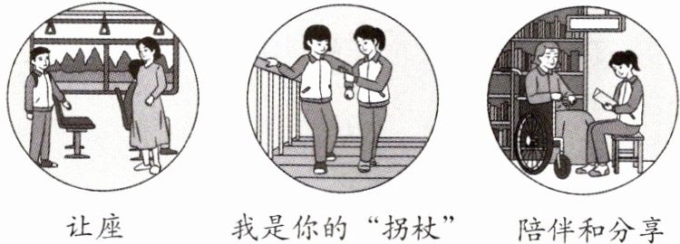 (1)“让座”体现了对他人的关爱;“我是你的‘拐杖’”体现了对同学的帮助;“陪伴和分享”体现了对长辈的关怀。他们都做到了关爱他人的生命,尊重、关怀和善待身边的人。