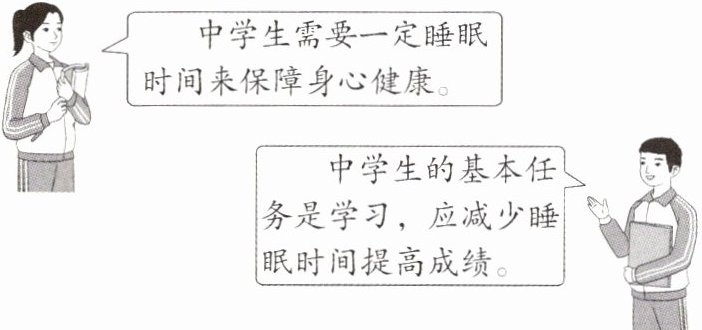 3. 教育部办公厅发布的《关于进一步加强中小学生睡眠管理工作的通知》要求,初中生每天睡眠时间应达到 9 小时。学校作息时间方面,中学上午上课时间一般不早于 8:00,同时强调,学校不得要求学生提前到校参加统一的教育教学活动,有条件的地方和学校应保障学生必要的午休时间。就寝时间方面,初中生一般不晚于 22:00。围绕着“睡眠时间”这个话题,两位同学发表了各自看法。