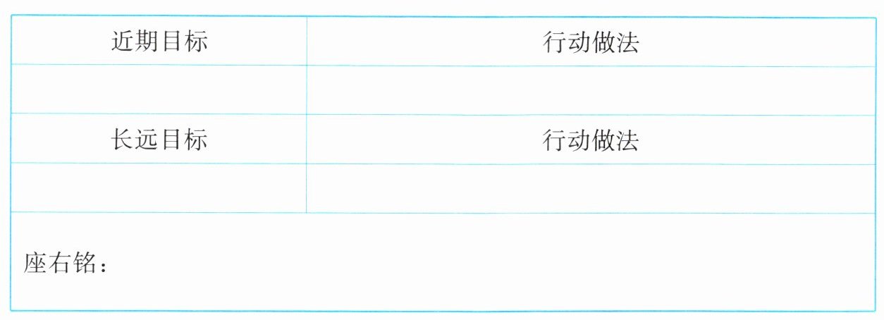 示例:①近期目标:参加省青少年科技创新大赛并争取获奖。行动做法:向科学老师请教相关专业问题,和小伙伴一起准备制作材料,利用周末完成等。②长远目标:成为一名科研工作者。行动做法:了解有关科学家或科研工作者的故事,坚定自己的理想信念;努力学习,考上理想的大学,选择理想的专业;积极参加实践,提高动手和创新能力;从点滴小事做起,发扬吃苦耐劳的精神,为实现目标艰苦奋斗。③座右铭:有志者,事竟成;天行健,君子以自强不息;既然选择了远方,便只顾风雨兼程。