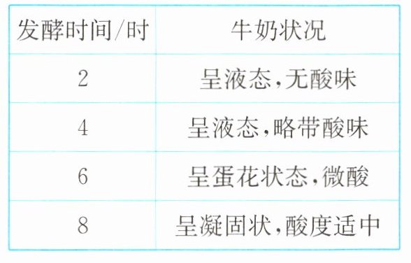 (5)该小组进一步探究了“制作酸奶的发酵时间”,实验结果如下表所示。根据实验结果,得出的结论是制作酸奶的发酵时间以