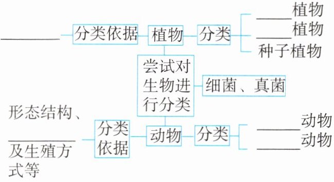 1. 动物的分类依据:除了要比较$\underline{形态结构}$,往往还要比较它们的生理功能以及$\underline{生殖方式}$等。