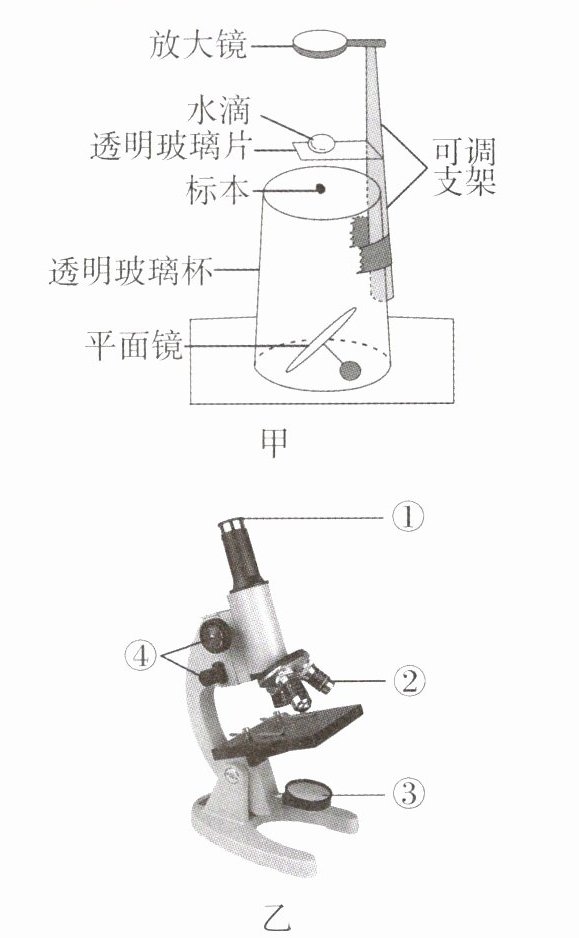 ]______准焦螺旋______。(4)“水滴显微镜”中的平面镜,相当于图乙所示光学显微镜结构中的[