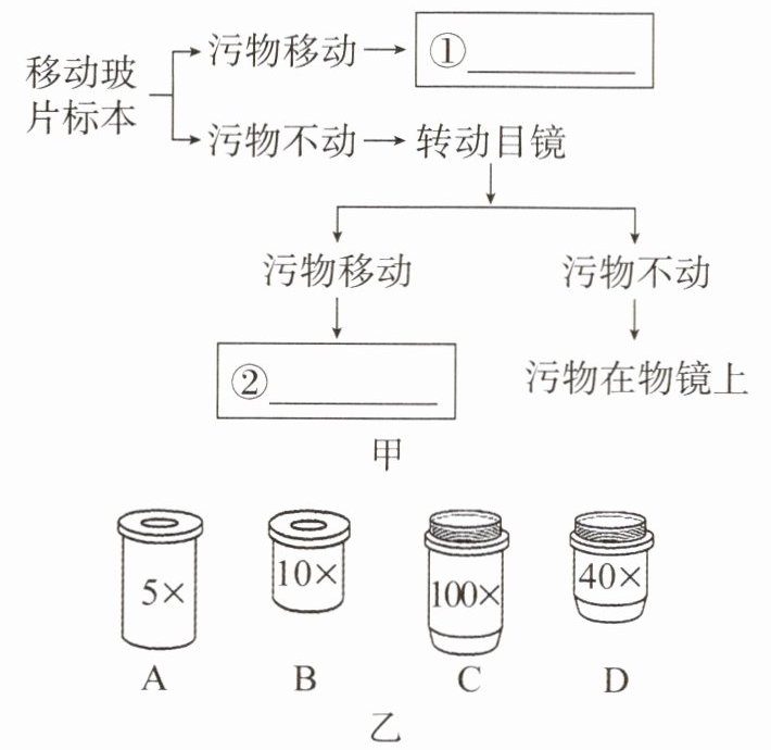 (1)某同学在使用显微镜时,经常发现视野中会有污物出现。该同学为了快速判断视野中污物可能存在的位置,画出了如图甲所示的思维导图。请你在图甲方框中填入合适的文字,将该思维导图补充完整。