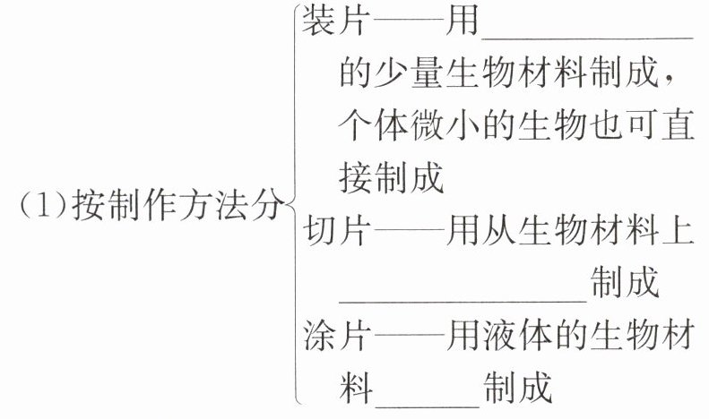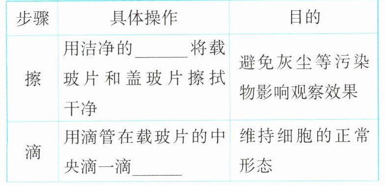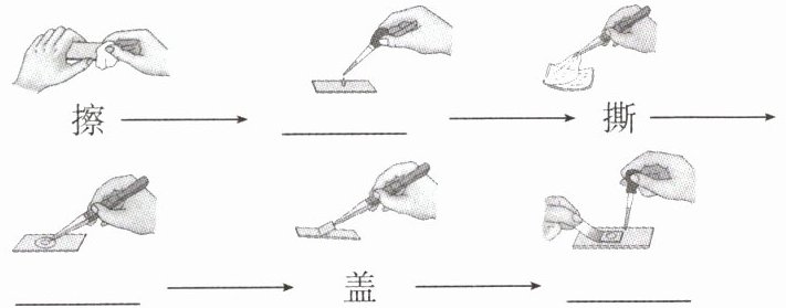 制作临时玻片标本的一般流程:擦(擦拭玻片) $\longrightarrow$ 滴(在载玻片中央滴一滴液体) $\longrightarrow$ 取(选取观察的材料) $\longrightarrow$ 放(将选取的材料放在载玻片上的液滴中,展平或涂抹几下) $\longrightarrow$ 盖(盖上盖玻片) $\longrightarrow$ 染(染色)。