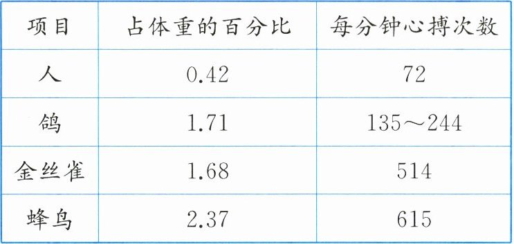 资料二 人与鸟的心脏占体重的百分比及每分钟心搏次数的比较(因个体差异,数据可能有所不同)。