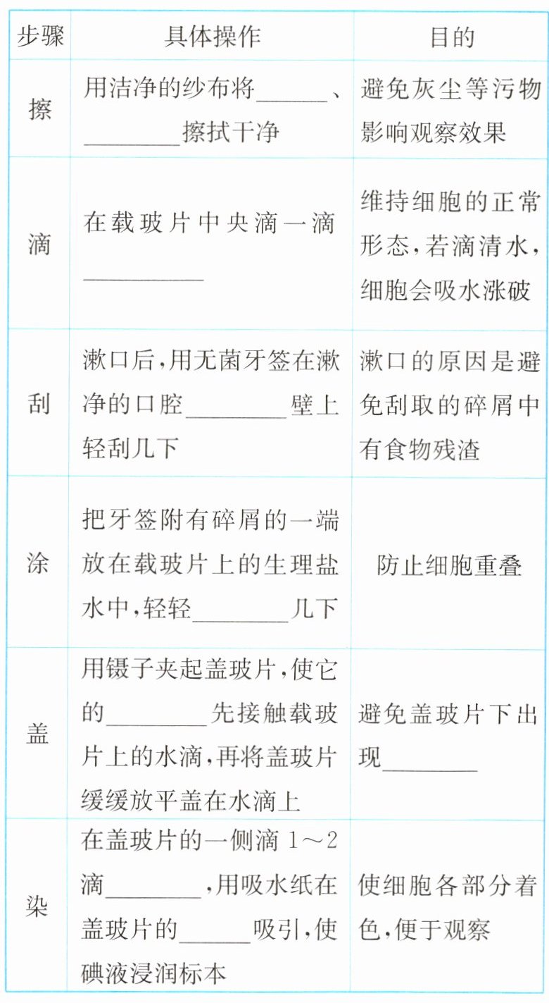 (1)载玻片 盖玻片 生理盐水 内 涂抹 一边 气泡 碘液 另一侧