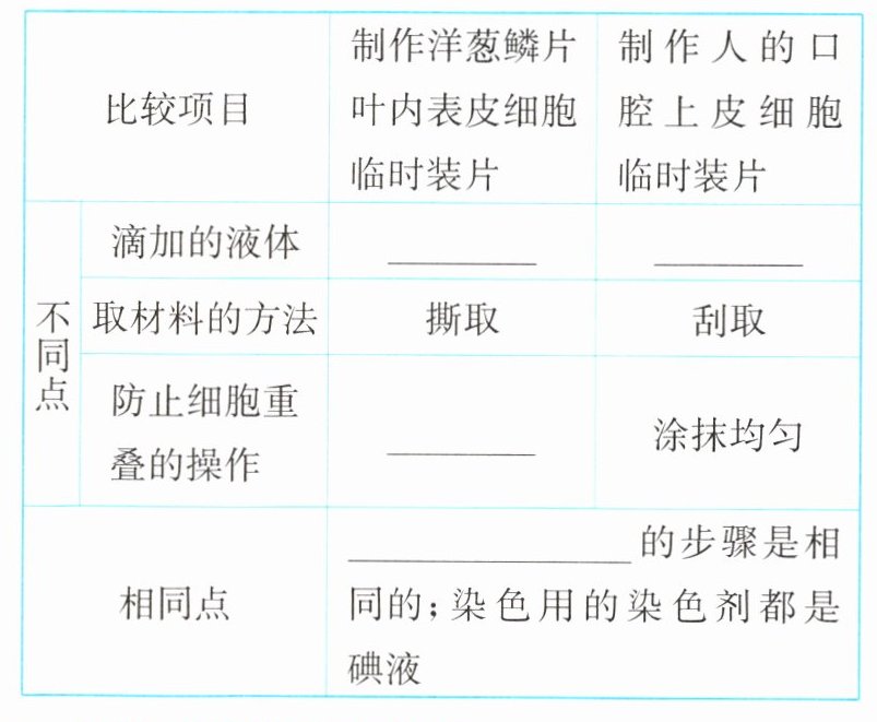 2. [对比归纳]制作洋葱鳞片叶内表皮细胞临时装片和人的口腔上皮细胞临时装片的异同