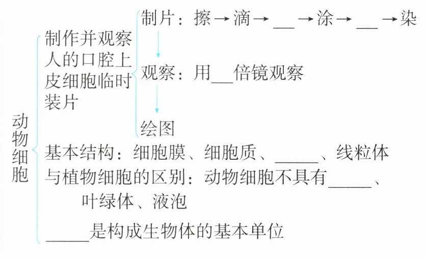 1. 小明同学制作了人的口腔上皮细胞临时装片,并用显微镜进行了观察。部分实验步骤和观察结果如下图所示,请据图回答下列问题。