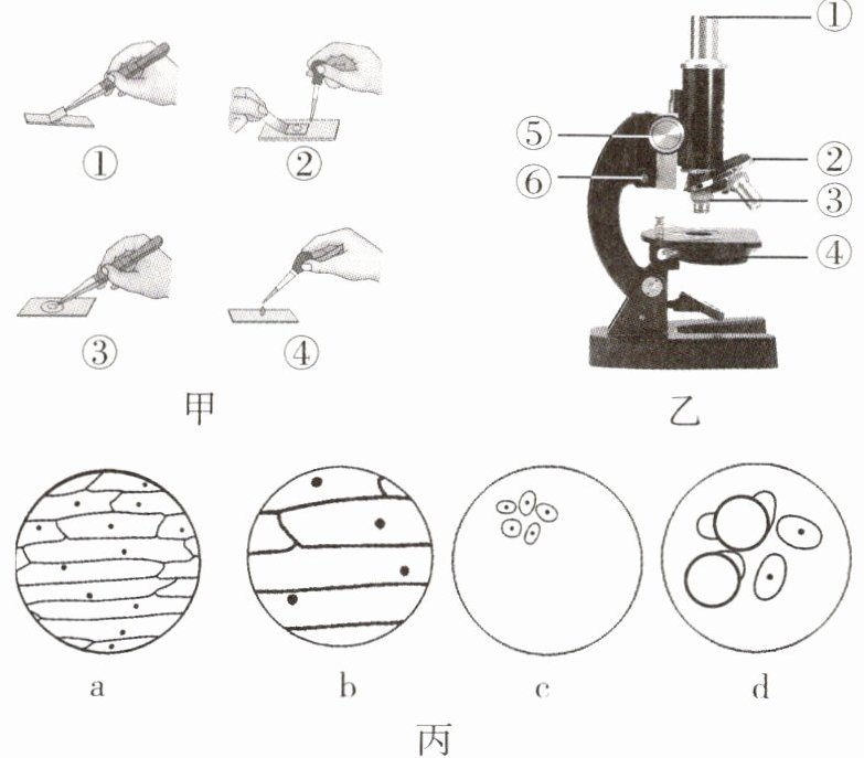 (2) 某同学用图乙所示显微镜观察制作好的两种临时装片时,得到图丙所示a~d四个图像,下列有关叙述正确的是(