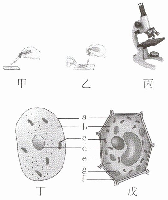 14. (四川眉山)图中甲、乙表示“制作人的口腔上皮细胞临时装片”或“制作洋葱鳞片叶内表皮细胞临时装片”实验的部分操作步骤;图丙为实验观察所用显微镜;图丁、戊分别为动物细胞、植物细胞的结构模式图。请回答下列问题。