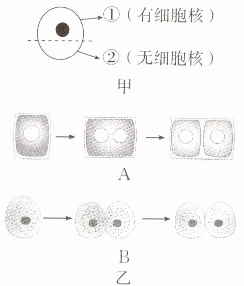 13. 实验法是现代生物学研究的重要方法。某生物学兴趣小组的同学为探究细胞结构与功能的关系,选择了一种再生能力很强的单细胞动物,做了图甲所示的实验。图乙中的 A、B 为动植物细胞的分裂过程示意图。请据图回答下列问题。