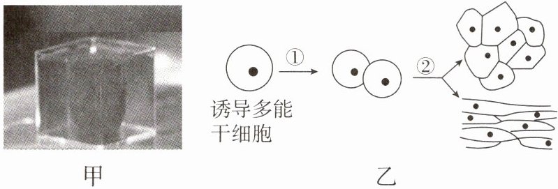 14. 干细胞是一类具有自我更新能力和多向分化潜能的细胞。在一定条件下,它可以分化形成多种细胞、组织或器官。科学家试图通过控制干细胞的分化过程培育出人体所需的组织和器官,以“替换”病损的部位。研究人员利用3D打印技术,成功用人体诱导多能干细胞制作出了3D打印心脏(图甲),图乙所示是由诱导多能干细胞产生心脏的上皮细胞、心肌细胞的过程。请据图回答下列问题。