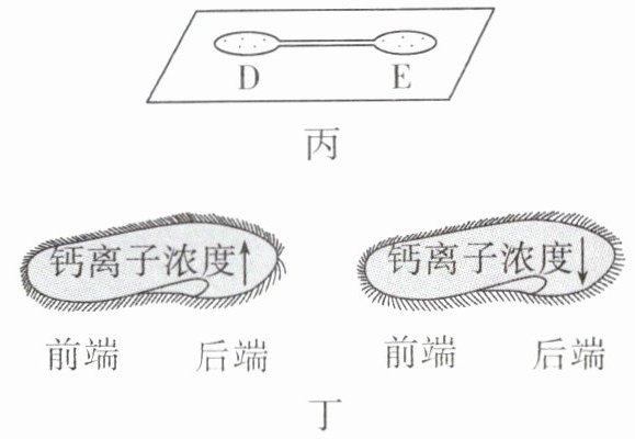 的摆动运动。有研究者探究了草履虫的回避行为,研究发现当草履虫前端遇到棉花纤维的阻碍时,它们会采取后退的方式,改变方向后,再试探着前进。研究者进一步实验发现,草履虫纤毛摆动的方向和细胞内的钙离子浓度有密切关系,结果如图丁所示。分析以上结果可知,当草履虫遇到障碍先后退、后前进的过程中,细胞内的钙离子浓度变化为先升高后降低
